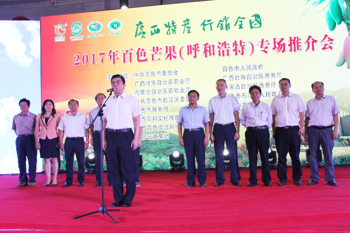 7月27日上午,由中共百色市委員會(huì)、百色市人民政府、內(nèi)蒙古自治區(qū)農(nóng)牧業(yè)廳、內(nèi)蒙古自治區(qū)商務(wù)廳、廣西壯族自治區(qū)商務(wù)廳、廣西壯族自治區(qū)農(nóng)業(yè)廳主辦的2017年百色芒果專(zhuān)場(chǎng)推介會(huì)在協(xié)會(huì)會(huì)員單位、內(nèi)蒙古食全食美集團(tuán)美通食品批發(fā)市場(chǎng)內(nèi)蒙古農(nóng)畜產(chǎn)品展銷(xiāo)大廳舉行。百色市委副書(shū)記、統(tǒng)戰(zhàn)部部長(zhǎng)楊春庭在推介會(huì)上宣布活動(dòng)正式啟動(dòng),內(nèi)蒙古自治區(qū)農(nóng)牧業(yè)廳副廳長(zhǎng)劉永志、百色市政協(xié)副主席韋曉東等領(lǐng)導(dǎo)出席推介會(huì),有關(guān)特邀嘉賓、百色市、縣有關(guān)部門(mén)代表、內(nèi)蒙古自治區(qū)有關(guān)部門(mén)、呼和浩特市有關(guān)部門(mén)負(fù)責(zé)人、客商代表、新聞媒體等參加會(huì)議。