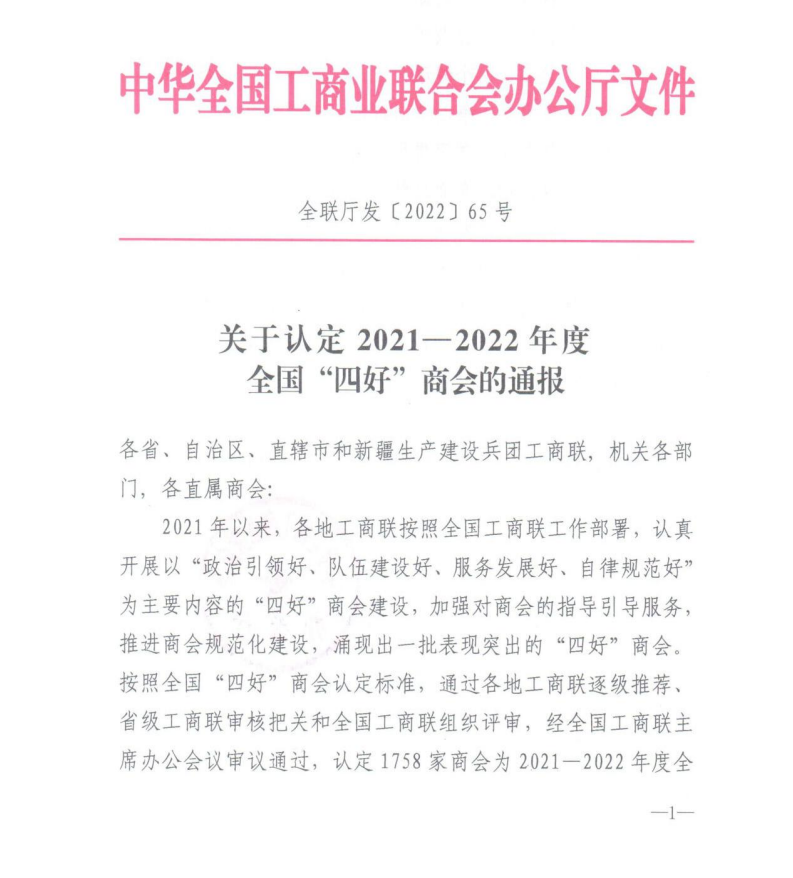 近日,中華全國工商業(yè)聯(lián)合會辦公廳發(fā)布《關(guān)于認定20212022年度全國“四好”商會的通報》,通報指出,按照全國“四好”商會認定標(biāo)準(zhǔn),在各地工商聯(lián)逐級推薦、省級工商聯(lián)審核把關(guān)、全國工商聯(lián)組織評審的基礎(chǔ)上,經(jīng)全國工商聯(lián)主席辦公會議審議通過,評選出2021-2022年度全國“四好”商會。內(nèi)蒙古農(nóng)牧業(yè)產(chǎn)業(yè)化龍頭企業(yè)協(xié)會等42家商(協(xié))會榮獲2021-2022年度全國“四好”商會榮譽稱號!