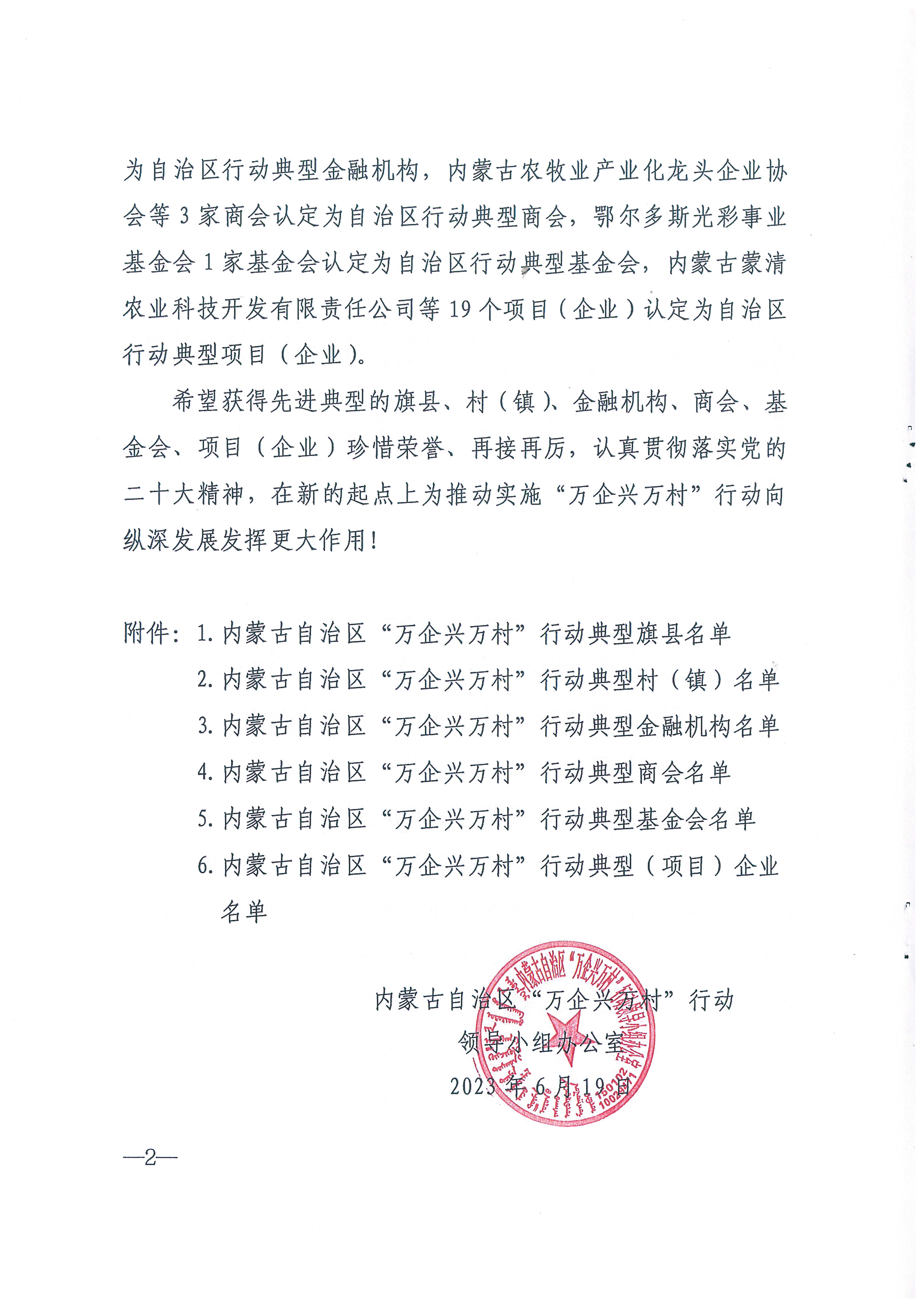 按照全國(guó)工商聯(lián)《關(guān)于做好 2023 年度全國(guó)“萬(wàn)企興萬(wàn)村行動(dòng)先進(jìn)典型選樹(shù)創(chuàng)建工作的通知》要求,經(jīng)自治區(qū)“萬(wàn)企興萬(wàn)村”行動(dòng)領(lǐng)導(dǎo)小組研究決定,將呼和浩特市和林格爾縣等 7個(gè)旗縣認(rèn)定為自治區(qū)行動(dòng)典型旗縣,呼和浩特市武川縣福如東村等8個(gè)村(鄉(xiāng)、鎮(zhèn))認(rèn)定為自治區(qū)行動(dòng)典型村 (鄉(xiāng)、鎮(zhèn)),中國(guó)農(nóng)業(yè)銀行股份有限公司內(nèi)蒙古自治區(qū)分行等 3 家金融機(jī)構(gòu)認(rèn)定為自治區(qū)行動(dòng)典型金融機(jī)構(gòu),內(nèi)蒙古農(nóng)牧業(yè)產(chǎn)業(yè)化龍頭企業(yè)協(xié)會(huì)等 3 家商會(huì)認(rèn)定為自治區(qū)行動(dòng)典型商會(huì),鄂爾多斯光彩事業(yè)基金會(huì) 1家基金會(huì)認(rèn)定為自治區(qū)行動(dòng)典型基金會(huì),內(nèi)蒙古蒙清農(nóng)業(yè)科技開(kāi)發(fā)有限責(zé)任公司等 19 個(gè)項(xiàng)目(企業(yè))認(rèn)定為自治區(qū)行動(dòng)典型項(xiàng)目(企業(yè))