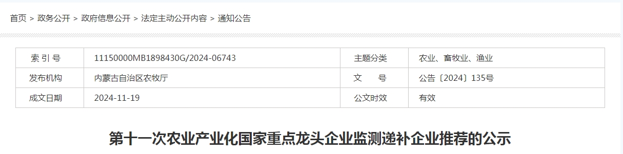 根據(jù)《農(nóng)業(yè)農(nóng)村部辦公廳關(guān)于開展農(nóng)業(yè)產(chǎn)業(yè)化國家重點(diǎn)龍頭企業(yè)企業(yè)監(jiān)測工作的通知》(農(nóng)辦產(chǎn)〔2024〕6號(hào))和《農(nóng)業(yè)產(chǎn)業(yè)化國家重點(diǎn)龍頭企業(yè)認(rèn)定和運(yùn)行監(jiān)測管理辦法》(農(nóng)經(jīng)發(fā)〔2018〕1號(hào))規(guī)定,立足我區(qū)農(nóng)牧業(yè)產(chǎn)業(yè)發(fā)展實(shí)際,我區(qū)開展了第十一次農(nóng)業(yè)產(chǎn)業(yè)化國家重點(diǎn)龍頭企業(yè)監(jiān)測審核和遞補(bǔ)推薦工作。經(jīng)第三方機(jī)構(gòu)審核、專家評(píng)審、相關(guān)九部門單位會(huì)議審查,擬推薦呼倫貝爾農(nóng)墾集團(tuán)有限公司、巴彥淖爾市圣牧高科生態(tài)草業(yè)有限公司、內(nèi)蒙古騎士乳業(yè)集團(tuán)股份有限公司、莫力達(dá)瓦達(dá)斡爾族自治旗沃豐生物質(zhì)新材料有限公司、內(nèi)蒙古阜豐生物科技有限公司5家企業(yè)遞補(bǔ)農(nóng)業(yè)產(chǎn)業(yè)化國家重點(diǎn)龍頭企業(yè)。