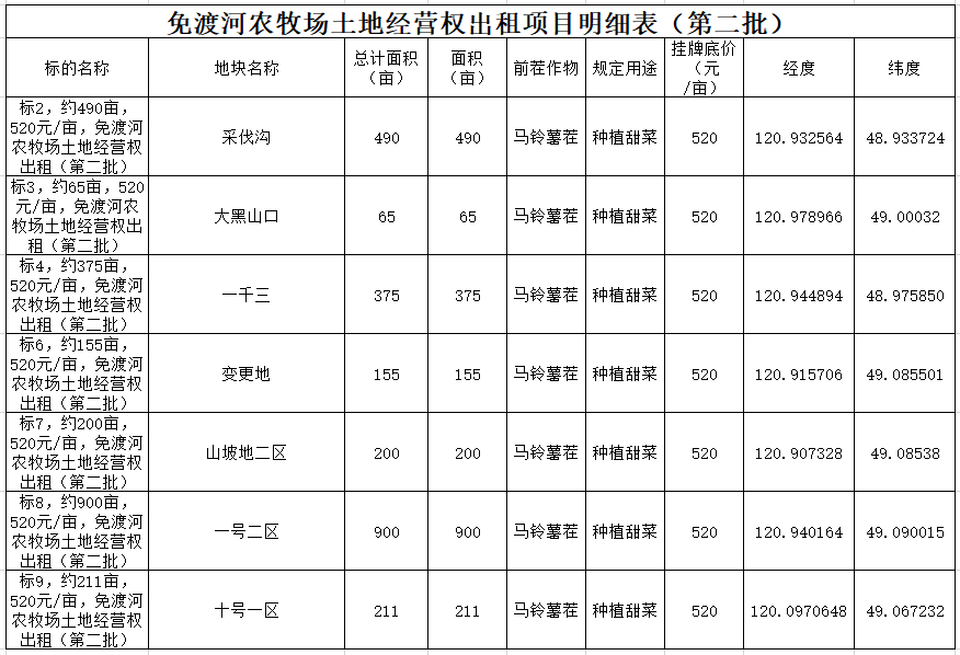 4.規(guī)定用途:第一批種植馬鈴薯,第二批種植甜菜,詳情以明細(xì)表為準(zhǔn)