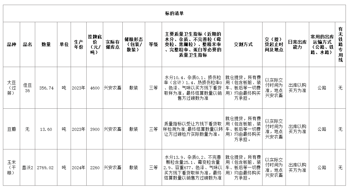 轉(zhuǎn)讓標(biāo)的為大豆(佳豆36)356.74噸、玉米(墾沃2)2769.02 噸、豆瓣13.6噸,標(biāo)的存放地位于呼倫貝爾市鄂倫春自治旗,詳情見標(biāo)的清單(含主要質(zhì)量指標(biāo)、存儲(chǔ)等信息):