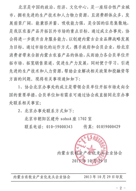 關(guān)于內(nèi)蒙古農(nóng)牧業(yè)產(chǎn)業(yè)化龍頭企業(yè)協(xié)會成立北京辦事處的通知