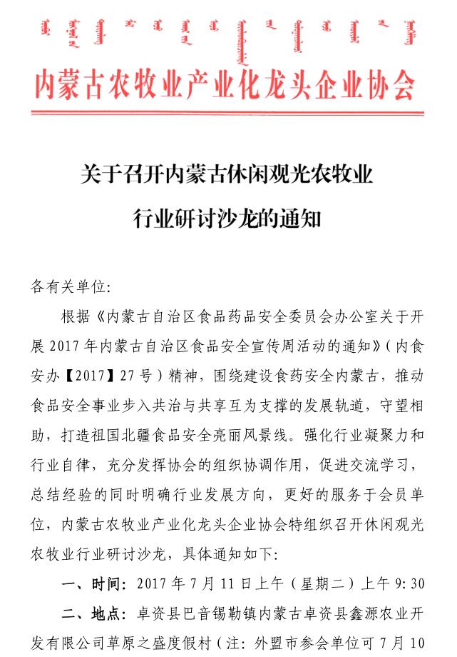關(guān)于召開內(nèi)蒙古休閑觀光農(nóng)牧業(yè)行業(yè)研討沙龍的通知
