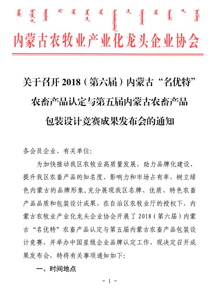關(guān)于召開(kāi)2018(第六屆)內(nèi)蒙古“名優(yōu)特”農(nóng)畜產(chǎn)品認(rèn)定與第五屆內(nèi)蒙古農(nóng)畜產(chǎn)品包裝設(shè)計(jì)競(jìng)賽成果發(fā)布會(huì)的通知