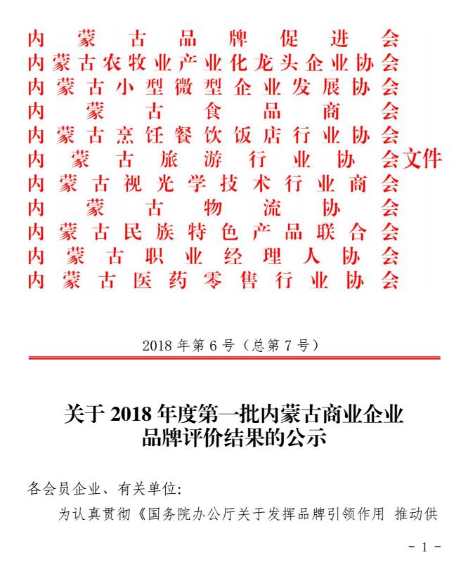 關(guān)于2018年度第一批內(nèi)蒙古商業(yè)企業(yè)品牌評價結(jié)果的公示