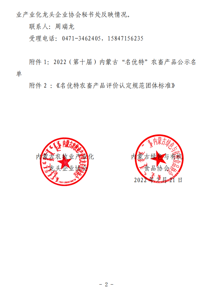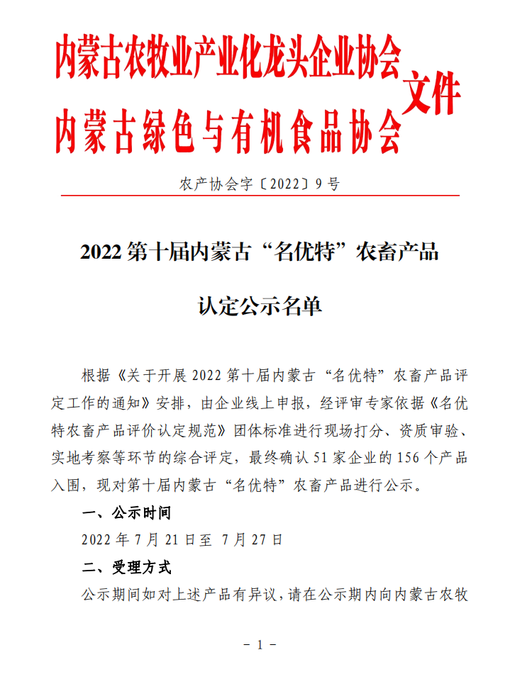 2022第十屆內蒙古“名優(yōu)特”農畜產(chǎn)品認定公示名單