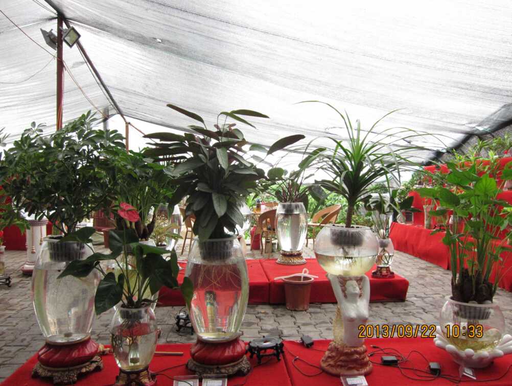 、形式多樣:水培花卉即可象普通花卉一樣一株一盆,也可以組合成盆栽藝術品;如果承接大型園林工程,可以融入山、水、魚、橋等,花在水中長,魚在池中游,景色新穎,高雅別致;也可將水培花卉培養(yǎng)在飯桌、茶幾、吧臺上,形成生態(tài)家具。辦公室、酒吧、咖啡屋、餐廳如果擺上這樣的家具,在吃飯、開會聊天時,又可觀賞奇花異景,平添高雅情調。