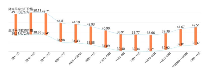 2020年中國生豬及豬肉價(jià)格走勢圖: