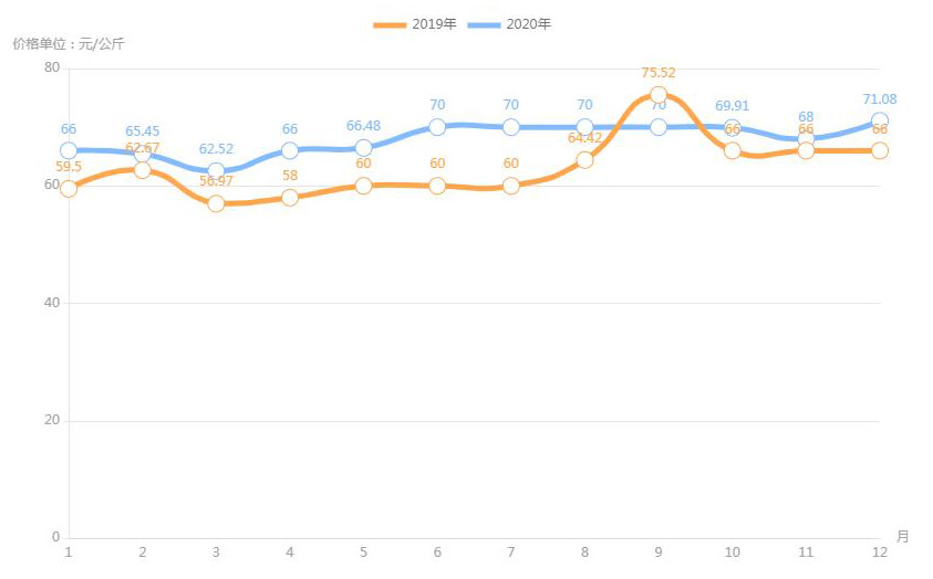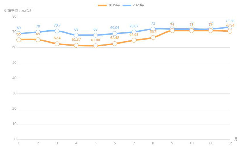對(duì)內(nèi)蒙古幾大農(nóng)貿(mào)批發(fā)市場羊肉價(jià)進(jìn)行匯總分析得出:呼和浩特市內(nèi)蒙古美通農(nóng)產(chǎn)品批發(fā)市場羊肉最高價(jià)格出現(xiàn)在2020年11月68元/公斤,最低價(jià)格出現(xiàn)在2019年4月52元/公斤。呼和浩特市東瓦窯批發(fā)市場羊肉最高價(jià)格出現(xiàn)在2020年12月73.38元/公斤,最低價(jià)格出現(xiàn)在2019年5月61.08元/公斤。包頭市友誼蔬菜批發(fā)市場羊肉最高價(jià)格出現(xiàn)在2020年12月67.16元/公斤,最低價(jià)格出現(xiàn)在2019年3月54元/公斤。內(nèi)蒙古赤峰西城市場羊肉最高價(jià)格出現(xiàn)在2019年9月75.52元/公斤,最低價(jià)格出現(xiàn)在2019年3月56.97元/公斤。羊肉價(jià)格和去年同期相比整體上漲,漲幅基本在每公斤5-15元左右。